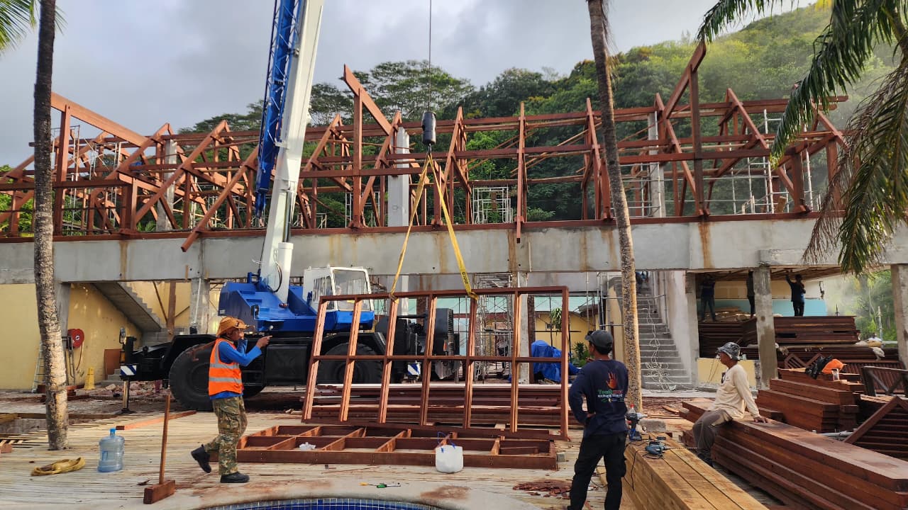 This project is built entirely from solid Bangkirai wood, featuring a dark finishing that brings out the natural character and depth of the timber. The structure uses large-sized beams and planks, giving it a bold, sturdy look that also ensures long-term durability — perfect for tropical and coastal environments.